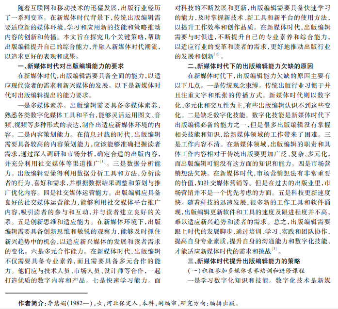 随着新媒体时代的到来,出版编辑需要不断提升自己的能力以适应新的媒体环境。本文探究了提升新媒 体时代下出版编辑能力的几个关键策略,包括积极参加多媒体素养培训和进修课程、全面了解市场数据和读者行为、提 升自身内容策划能力、掌握社交媒体平台的特点和规律、加强多方面合作、提升自身数据分析能力及写作能力。这些策 略可以帮助出版编辑在新媒体时代中有更好的表现,实现内容的创新和影响力的提升。