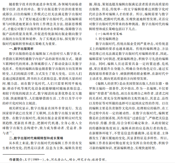 随着数字出版时代的到来,传统的编辑出版发生了很大变化,诸多编辑不得不转型发展。本文分析数字出 版的概念及特征,有针对性地提出数字出版时代编辑转型和成长策略,探讨创设更多适应出版新业态的空间与机会,为 类似研究提供参考。