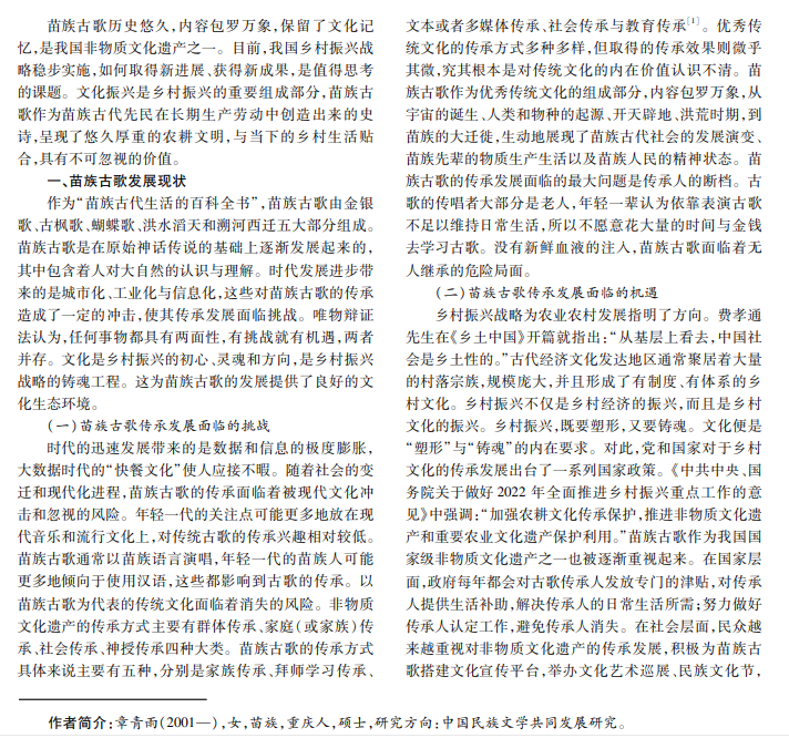 苗族古歌被学者称为“苗族古代生活的百科全书”,是苗族先民在长期生产劳动中创造的史诗,具有重要 的文学价值。在乡村振兴战略时代背景下,深入挖掘苗族古歌在乡村生态、乡村生产、乡村文化方面的价值与意义,加 大对非物质文化遗产的保护传承,创新、融入新时代精神,能够为新时代乡村振兴赋能。