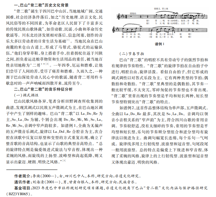 巴山“背二歌”源于巴山深处马帮式、骆驼式运输民工背货、歇息时的呐喊与对答,具有浓厚的生活气息和 生动的音乐感染力,“背二歌”以其悠久历史、独特个性以及强大的音乐表现力,于 2006年获批列入第一批国家级非物 质文化遗产名录。