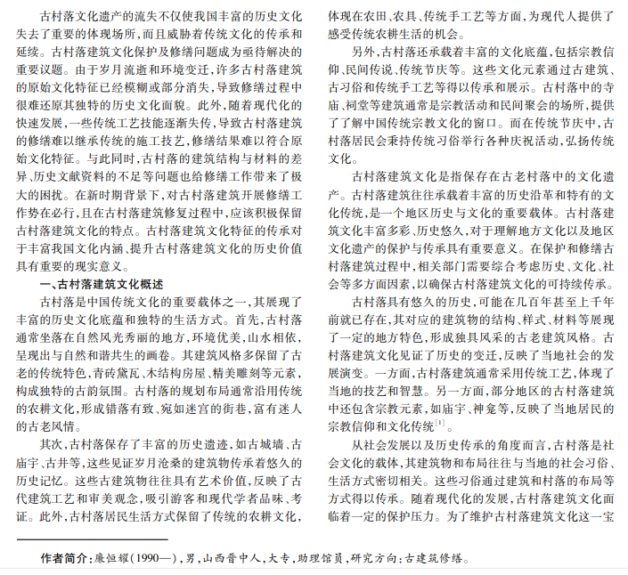 古村落建筑作为中国传统文化的珍贵遗产,在现代城市化进程中面临着日益严峻的挑战。随着城市化的 推进,古村落建筑存在严重的老化、破损和失修问题。加强对古村落建筑文化的保护势在必行。本文通过深入探究古 村落建筑文化的内涵以及特征,分析传统文化保护背景下古村落建筑实施修缮难点,提出古村落建筑修缮的优化策略, 为保留与传承古村落建筑文化提供参考性意见。