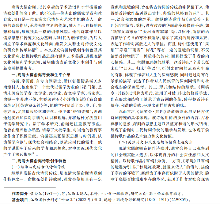 晚清大儒俞樾创作的诗词,不仅在继承与发扬古诗词传统上起着重要作用,而且对后来的文学创作产生了 深远的影响。本文简要介绍俞樾生平,并从继承和发扬古诗词传统、注重思想情感表达、关注历史民生等方面,分析俞 樾诗歌创作特色,探讨俞樾诗歌的文化影响。