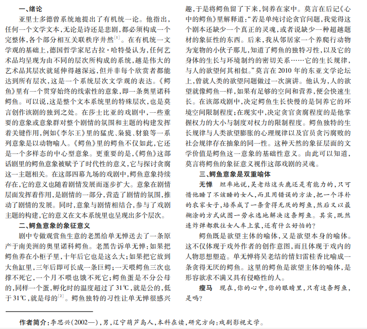 2012年诺贝尔文学奖获得者莫言于 2023年出版了话剧剧本《鳄鱼》,该作品艺术再现了畏罪潜逃至美国 的贪官单无惮与妻子、情妇等人的纠葛,最终家破人亡的故事。具有讽刺意味的是,单无惮在别墅里饲养了一条鳄鱼作 为情感支持动物,这条具有魔幻现实主义色彩的鳄鱼陪伴单无惮走完了他人生的最后十年。最终,单无惮葬于鳄鱼之 腹。鳄鱼作为这部话剧的中心意象,成为整部话剧的灵魂,本文分析其文学意义。