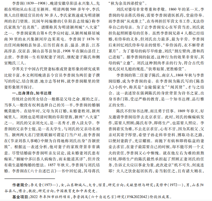 晚清阜阳人李普润任知县 30年,一生有原配妻子刘氏、继配妻子陈氏和侧室鲍氏三人。他认为贤妻的标 准有三:一是出身清白,知书达礼;二是忠贞不贰,关心丈夫;三是生育子嗣,传续香火。