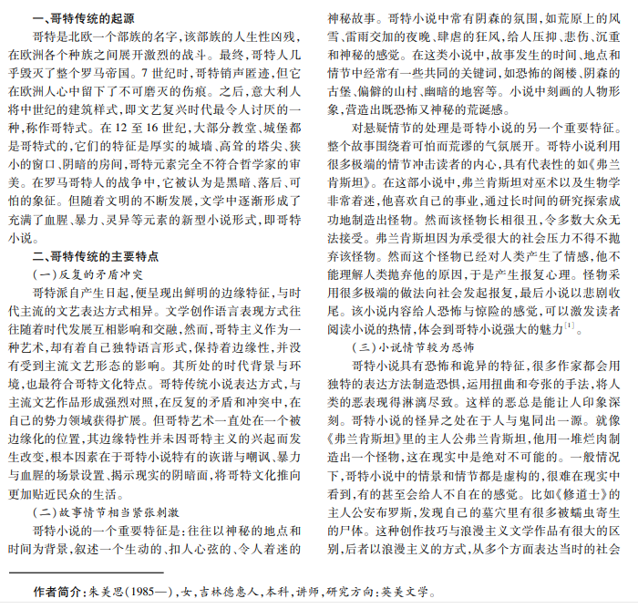 自 18世纪晚期哥特小说问世以来,哥特式的艺术技巧就被大量运用于英美文学,并对其产生了深刻的影 响。哥特式文学在维多利亚时期曾经一度繁荣,被归入恐怖、魔法、宗教、审美等领域,有着与生俱来的极端追求,营造 孤独、冷漠、阴郁感觉。哥特元素是英美文学中不可忽视的存在。