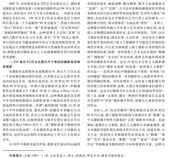 本文从摄影美学体系博弈和摄影的“take/make”图像创作模式两个角度入手,结合摄影史学、视觉心理学、 媒介学等相关理论,对摄影家安德烈亚斯·古斯基的摄影名作《99美分Ⅱ》的图像审美逻辑展开梳理和分析,探究摄影 媒介特性如何潜在地支配摄影美学体系主轴运行以及其运行模式的逻辑基础构架。