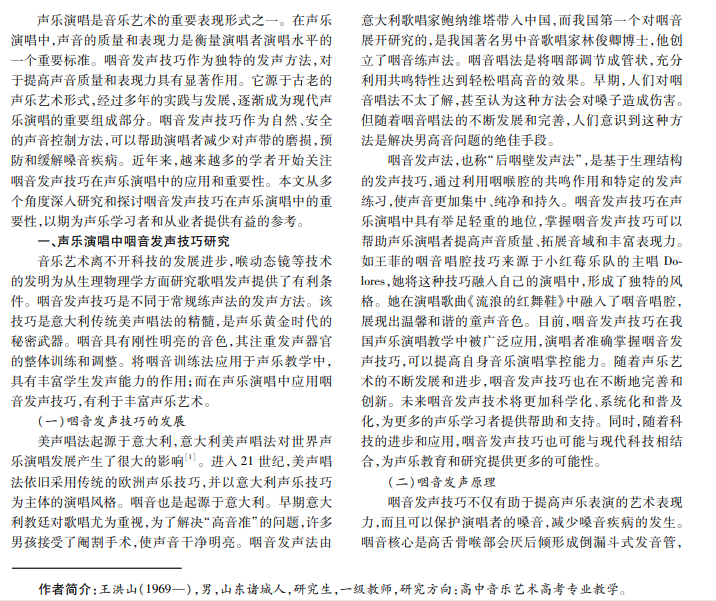 咽音发声技巧在声乐演唱中的重要性不言而喻,它可以帮助演唱者提升音质、拓展音域,并保护嗓音。通 过长期的咽音发声训练,演唱者可以掌握正确的呼吸方式,利用咽部共鸣让声音更加集中和有穿透力。此外,咽音发声 还可以丰富演唱者音色,增强艺术表现力。因此,咽音发声技巧是每位声乐演唱者必须掌握的重要技巧之一。在训练 过程中,持之以恒的练习是关键。通过练习,演唱者可以逐渐熟练掌握咽音发声技巧。本文探讨咽音发声技巧在声乐 演唱中的重要性以及其在增强声音集中性、拓展音域、保护嗓音和提升艺术表现力等方面的应用,提出掌握咽音发声技 巧的策略,包括正确的呼吸方式、练习咽喉腔共鸣、长期坚持训练等。