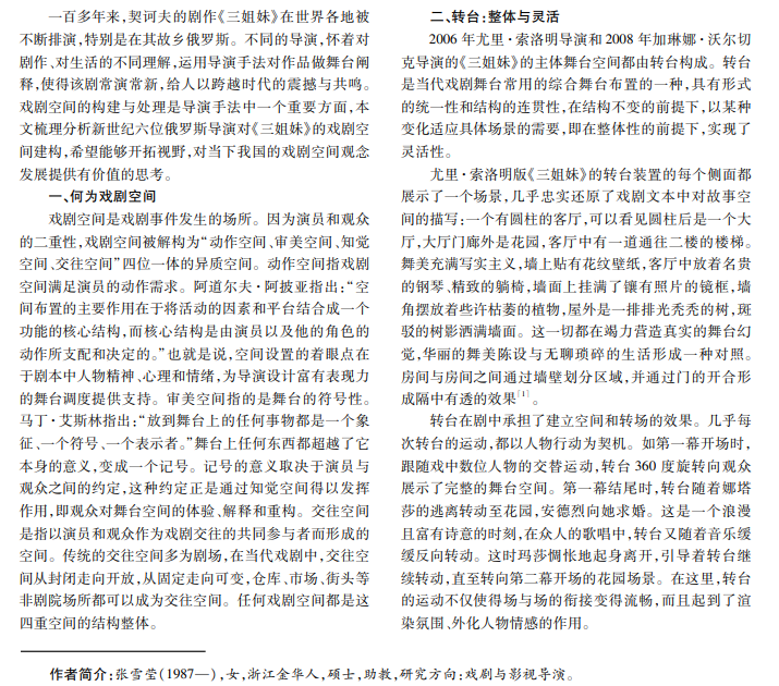 一百多年来,契诃夫剧作《三姐妹》在俄罗斯被不断解读、排演。新世纪以来,俄罗斯导演对《三姐妹》戏剧 的创作,或以现实主义表演为根基进行形式创新,在写实与写意、传统与创新中寻找平衡;或打破传统,以主观化、个人 化手段对剧本做另类诠释。本文梳理解析新世纪六位俄罗斯导演对《三姐妹》的戏剧空间建构,希望对戏剧空间探索 实践提供有价值的思考。