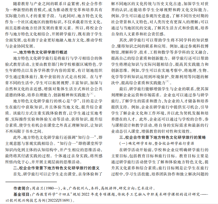 结合地方特色文化开展研学旅行不仅能拓展学生知识面,而且能促使企业更好地融入当地文化,实现校企共 赢。本文概述地方特色文化研学旅行,并分析校企合作背景下地方特色文化研学旅行的意义,探讨其策略,以供参考。