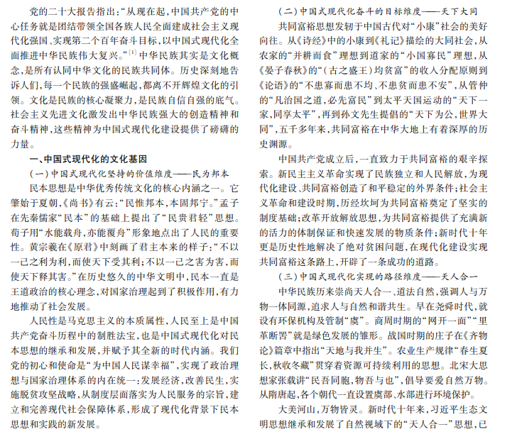 中国式现代化摒弃了西方现代化以资本为中心的逻辑思维,服务于最广大人民的根本利益,致力于创造中 华文化新的辉煌,使中国人民破除西方迷思,重拾文化信心。文化自信自强是中国式现代化在文化领域的最新成果,构 建了人类文明新形态。中华文明在中国式现代化的基础上得以延续与更新。