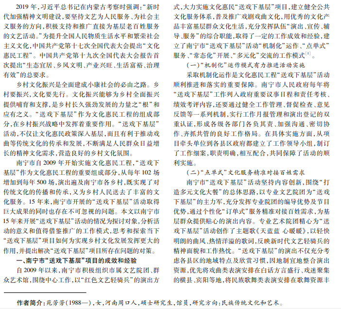 “送戏下基层”项目作为南宁市开展“为民办实事”文化惠民工程的一个重要内容,自 2009年开展以来,累 计演出达 3706场,通过形式多样、内容充实、内涵丰富的文化产品充实和活跃基层群众文化生活,满足了城乡群众就近 享受文化服务的需求。同时,该项目以戏剧戏曲演出为载体,推动戏剧戏曲文化在乡村的传承推广和普及,培育传承群 体,为乡村文化注入了新的活力,促进了乡村文化的振兴。