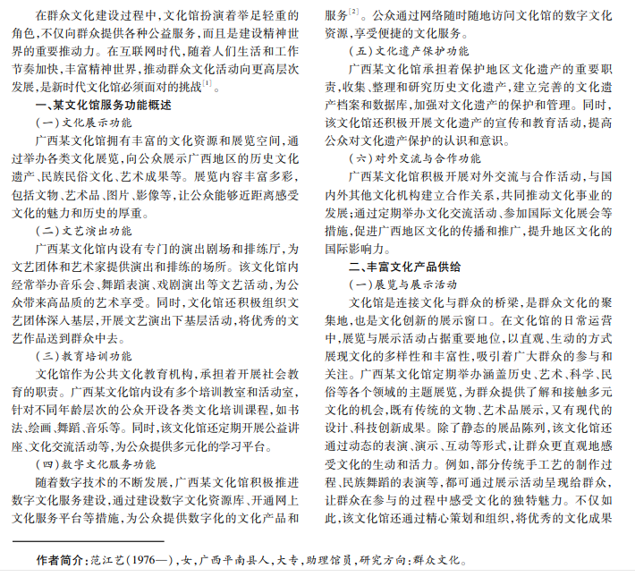 随着社会进步和人民生活水平不断提高,群众文化需求越来越多样化。作为社会公共文化服务体系中的 重要一员,文化馆在满足群众文化需求的同时,承担着引导、培育和保护优秀传统文化的重要职责。本文以广西某文化 馆群众文化服务为例,分析文化馆在群众文化管理中的引领作用,并提出加强文化馆工作的策略和措施,旨在为丰富群 众文化活动提供支持。