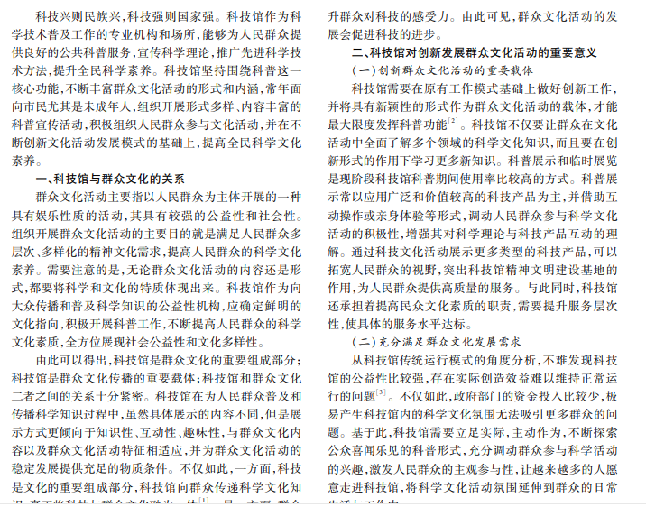 目前,社会创新发展速度加快,人民生活品质逐步提高,精神文化需求旺盛。科技馆科普功能与群众文化 建设紧密关联,其不仅能为群众文化注入活力,而且能满足人民群众高质量文化需求。本文从科技馆与群众文化的关 系入手,针对科技馆如何发挥科普功能创新性开展群众文化活动展开探讨。