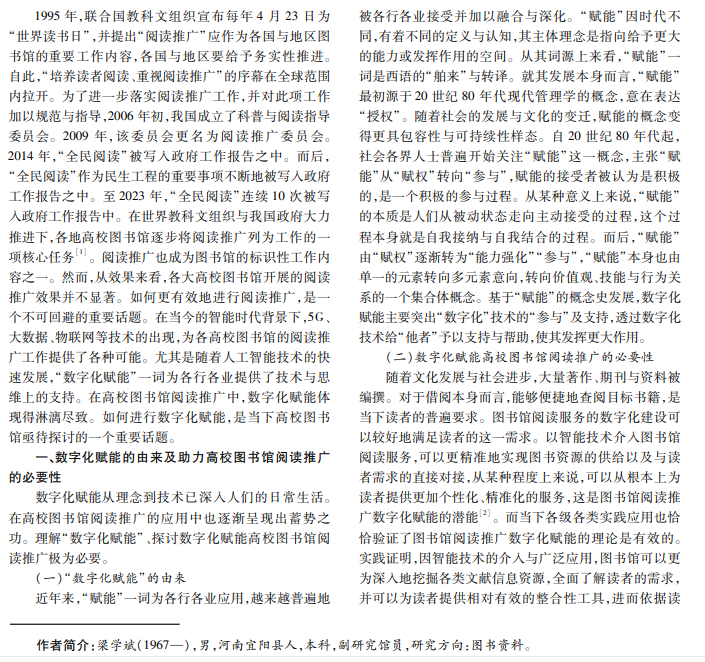 高校图书馆肩负着传播知识、推广阅读的责任。而数字赋能阅读推广服务,是提升高校图书馆服务能力和 改善供需关系的重要途径之一。本文从数字化赋能视角出发,运用文献资料与逻辑分析相结合的研究方法,对高校图 书馆阅读推广进行剖析,并在此基础上提出高校图书馆可持续发展策略。