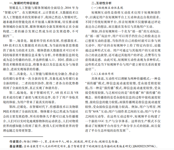 在互联网技术与媒介技术的发展驱动下,浏览短视频已然成为当前社会公众习以为常的娱乐消遣。智媒 时代的到来,改变了人们的生活方式和信息传播方式。在当下短视频领域,抖音短视频凭借独特优势和巨大用户规模, 成为最具代表性和影响力的短视频平台。在互动视频传播的推动下,短视频的用户黏性不断增强,为短视频行业发展 提供了全新思路。本文以智媒时代视角分析抖音短视频互动性发展。
