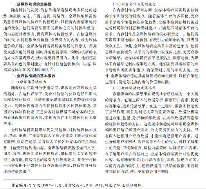 随着互联网、移动终端、社交媒体等新兴媒体的快速发展,传统媒体与新兴媒体逐渐融合,形成全新传播格 局。在此背景下,全媒体编辑应运而生,成为融媒体时代重要角色。全媒体编辑需不断提升各方面能力,适应行业发展 需求,适应全新的融媒体新闻传播事业。