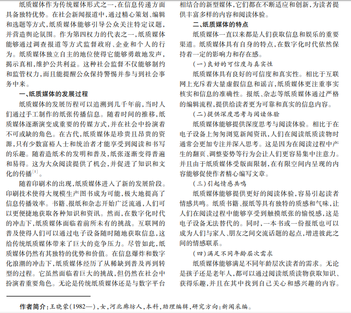 一直以来,在信息传递、舆论引导、社会监督方面,纸质媒体都发挥着不可替代的作用。随着数字技术的不 断发展和进步,自媒体、数字媒体逐渐成为提供新闻和信息来源的主要载体,给纸质媒体的生存和发展带来冲击。但审 视纸质媒体的历史发展沿革,其在媒体资源、客观真实性、权威性等方面都有重要影响,在社会新闻报道中仍然扮演着 重要角色。