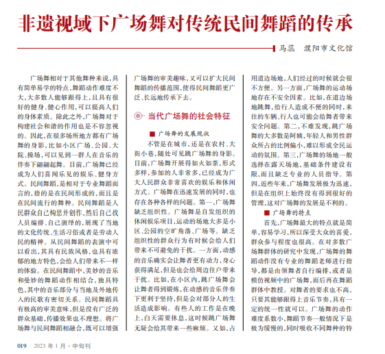 随着物质生活水平的不断提 高,人们文化生活逐渐丰富起来, 广场舞成为当今社会一大主流运 动方式,不仅在中老年群体中流 行,而且受到年轻人的青睐。广场 舞受众群体广泛,具有一定的传播 优势。传统民间舞蹈具有较强的艺 术欣赏性,将其与广场舞结合,不仅 能够丰富舞蹈形式,而且能为传统 文化传承提供新的载体,使得传统 民间舞蹈得到更好的传承与发展。