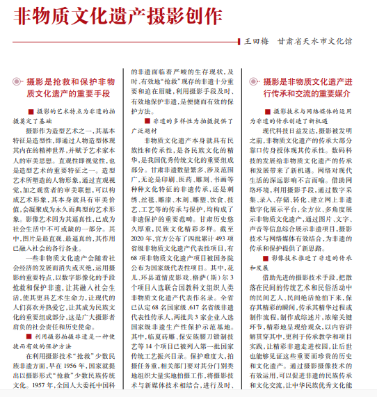 造型艺术的基本特征是造型性,即通过人物造型体现其内在的精神世界,并寄予艺术家的 审美思想。非物质文化遗产是各民族珍贵的文化积淀和历史记忆,是一个民族的文化精髓,是人 类的共同财富。甘肃历史悠久,非遗名目繁多,内容丰富多彩。在数字化发展的今天,摄影对非物 质文化遗产的记录宣传和传承发展发挥着重要作用。拍摄甘肃非物质文化遗产意义重大,既是对 甘肃非遗的传承与发展,也是实现人类文明延续和可持续发展的要求。
