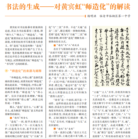 黄宾虹在谈论书法临摹时说:“师古人,不若师造化。”但是,“造化”究 竟是什么呢?是卫夫人眼中的“横,如千里阵云”,又或是蔡襄笔下“夫书肇 于自然”?“造化”何为,黄宾虹没有解读清晰,而“师造化”所达到的效果便 是“笔自家写法,亦笔笔自古人得来”。