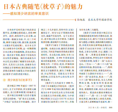 清少纳言是平安中期的宫廷侍女,著《枕草子》传世。 《枕草子》是日本中古时期的随笔,清少纳言基于深厚教养 的敏锐、纤细的审美意识,为读者展示了自然与人事的魅 力。尽管皇后定子的宫廷生活充满孤寂与悲伤,但是清少 纳言竭尽全力描写得阳光明快。《枕草子》开创了全新的美 学范畴,其“明快”之美与《源氏物语》的“物哀”审美思想并 驾齐驱。因此,《枕草子》被称为“阳光”“青春”而又“富于高 度理智”的文学。