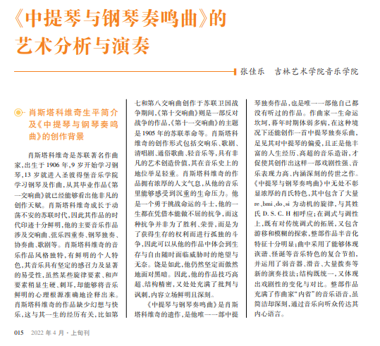 《中提琴与钢琴奏鸣曲》 是肖斯塔科维奇生前最后一 部作品,也是其唯一一部中 提琴独奏作品。在交响乐与 室内乐的创作中,肖斯塔科 维奇对中提琴的运用几乎超 过其之前所有的作曲家,研 究《中提琴与钢琴奏鸣曲》的 艺术特色及演奏技术对于中 提琴演奏者具有重要意义。