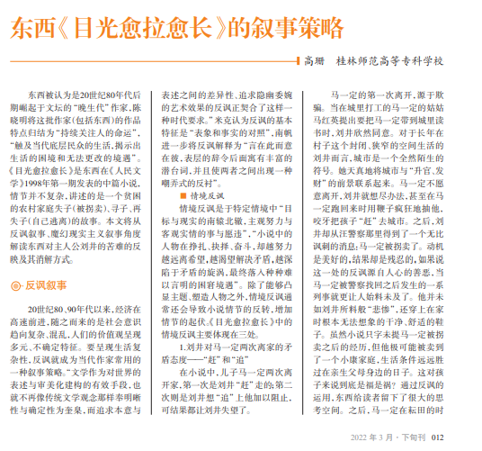 东西的中篇小说《目光愈 拉愈长》从反讽叙事、魔幻现实 主义叙事方向对女主人公刘井 的苦难进行了反映和消解。《目 光愈拉愈长》中的三处情境反 讽都围绕刘井展开,她努力地去 解决生活中的一系列困难,却总 是偏离正确的轨道,滑向错误的 方向。而小说让人动容的事实 与“客观”的叙述方式二者间的 不协调,产生了反讽意味。受魔 幻现实主义文学影响的“目光” 意象,成为作者为底层苦难者提 供的一种想象性的精神解脱。