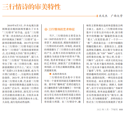 自2010年“三行情书”新 型诗歌体裁第一次在国内正 式出现,到2021年青年作家网 举办首届三行情诗大赛,这种 新型诗歌体裁逐渐被文坛大 众所接受。本文通过整理近 十年来三行情诗新作,总结出 其趣味性、对话性与跳跃性的 艺术特征,同时发现三行情诗 创作模式虽发源于日本汉字 协会,但与中国经典《诗经》 在选题日常、韵律和意蕴上有 较强的承继关系。