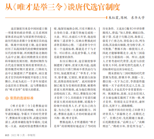 曹 操《 唯 才 是 举 三 令》堪称古代君王求贤令 之范本,其中提出的“唯 才是举”的观点虽然受到 一些质疑与反对,但是基 本为后代君主所采纳和 施行。这也体现了选拔 人才与治理国家之间的 密切关系。