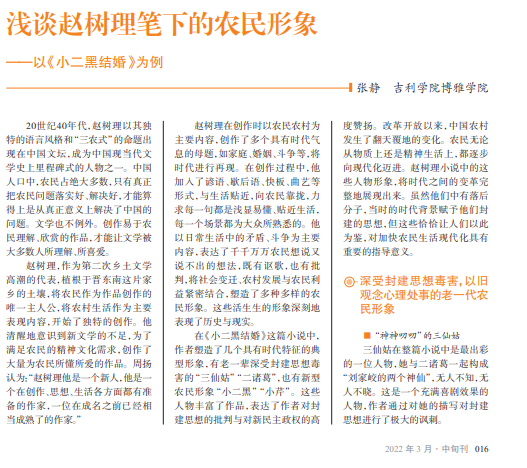 赵树理被称为“具有 新颖、独创的大众风格的人 民艺术家”。他长期生活在 群众中,对群众思想的变化 非常熟悉。他塑造了很多 生动形象的农民形象。其 作品《小二黑结婚》中农民 形象极具时代气息,广受 好评。