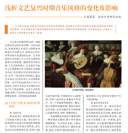 文艺复兴时期,作曲家开始追求音乐和文学的联系,形成很多不同以往的音乐风格,探索出很多新的 音乐题材。音乐风格呈现了兼容宗教和世俗文化的变化,强调个性与情感表现,为后期巴洛克、古典主义、 浪漫主义的风格形成奠定了基础。
