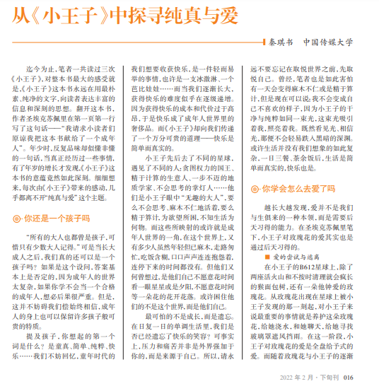 《小王子》这本书 以最朴素、纯净的文字 和独特的情节人物设计 为全球读者们所喜爱。 笔者认为,《小王子》最 神奇之处在于,不同年 龄段、不同心境下阅读, 它总能带来一些新的启 发和意蕴深远的人生 哲思。