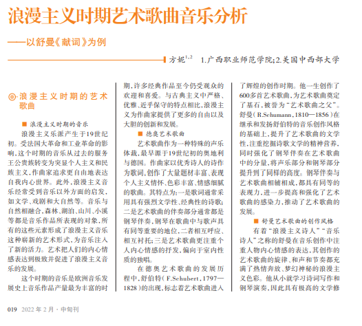 浪漫主义时期的艺术歌曲 作为一种声乐体裁,丰富了声 乐的多样性,也是音乐从服务 于宫廷贵族转变到音乐大众化 和表现个人主义情感的重要体 现。德国作曲家舒曼为艺术歌 曲的发展做出了重要贡献。他 注重诗歌文学与音乐的互相 融合,创作了大量题材丰富、旋 律优美、情感细腻的艺术歌曲。 《献词》是一首传播广泛、具有 一定代表性的艺术歌曲。