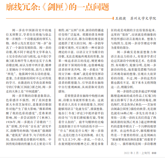 闻一多在中国新诗史中的地 位无须赘言,学者往往将他与徐志 摩一并视作一个诗歌流派的领军人 物。孙作云先生更是以“闻一多”命 名了一个新诗发展阶段。闻一多的 诗歌,既不同于胡适等文学革命人 士完全崇尚白话与欧化,也不似《学 衡》派及林纾等人绝对忠实于古典 诗歌法则,而认为要中西并蓄,精神 上更倾向于中国传统,技巧上则要 “西化”。他强调中国古诗的意境、 意象,力求创新的同时不忘对传统 的学习。在激进的文学改良派和保 守的《学衡》《国故》派之间,闻一多 走的大体上是“中间道路”。