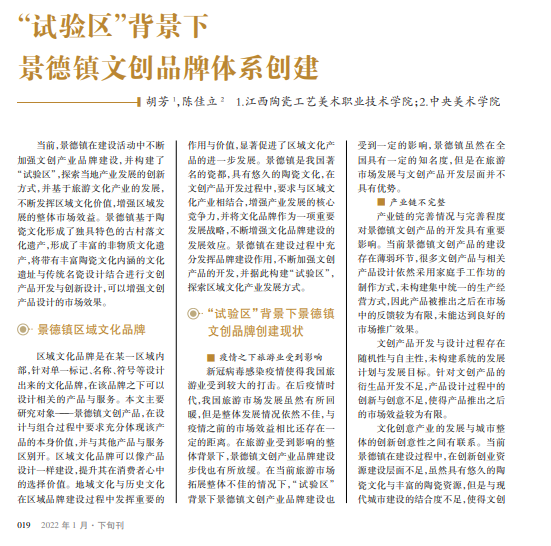 如何打造促进当地经济发展的文化 产业,成为当下区域发展亟待解决的问题 之一。景德镇具有丰富的历史文化资源与 一定的市场名声,当前正不断加强文创产 业品牌创建。本文以景德镇国家陶瓷文化 传承创新试验 区(文 中 简 称“ 试 验 区”) 建设为背景,分析当前景德镇陶瓷文化创 意产业发展中存在的问题,并提出相应的 优化策略,以促进当地经济的发展。