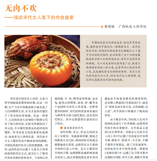 中国的饮食文化源远流长,经过岁月的洗 练,最终成为中国文化一张靓丽名片。在历史 的长河里,历朝历代的饮食文化都被打上了属 于它们的时代烙印,充分体现了生产力的发展 轨迹和当时人们的价值追求,有利于还原历史 的面貌。文人对美食的记录内容广泛,既有王 侯将相享用的八珍玉食,也有市井小民的家常 小菜,是发掘饮食文化的绝好素材。本文从宋 代的肉食文化入手,结合宋代文人的诗歌、笔 记等记录探索宋代的肉食风貌。