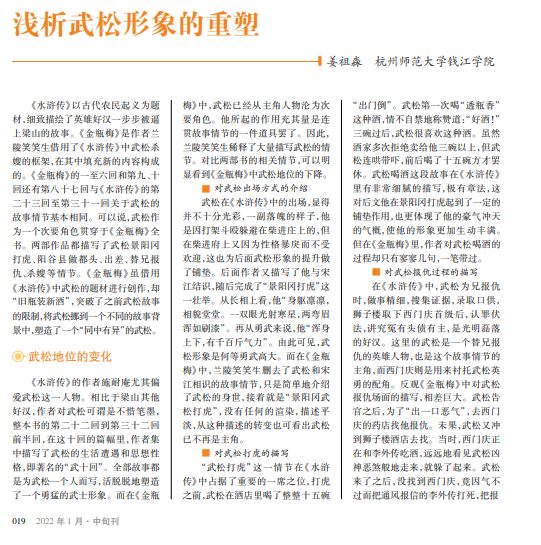 在我国明代四大奇书中,《水浒传》和《金瓶梅》两书都塑造 了武松这一好汉形象,使得武松家喻户晓。虽然两部作品关于武 松的故事情节有重叠之处,但是由于创作主旨和时代精神的不 同,两部作品中的武松形象大相径庭。文章从武松的地位变化、 形象变化、形象重塑的原因三个方面深度剖析两部作品的异同, 让武松从理想化的英雄好汉变成了有着人性弱点的凡人武松, 使其更形象化和立体化。