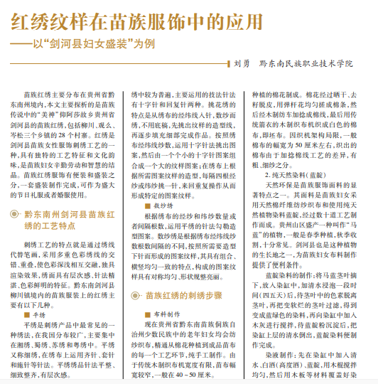 贵州省黔东南苗族侗族自治州剑河县境内的苗族服饰中的红绣,以其精湛的刺绣工艺和装饰手法,将 纹样和强烈色彩的搭配发挥到了极致。本文笔者实地走访了剑河县红绣主要集中地柳川镇返迷村等几个 苗族村寨,从当地妇女口中了解了红绣的针法、色彩选用、材料制作等,分析归纳总结苗族妇女盛装中红绣 的材料制作、纹理图样、刺绣工艺和色彩搭配等。分析解构、总结归纳当地少数民族服饰文化传承对苗族服 饰文化在非物质文化遗产传承上具有一定意义,同时为现代服装与服饰设计提供了设计灵感来源。