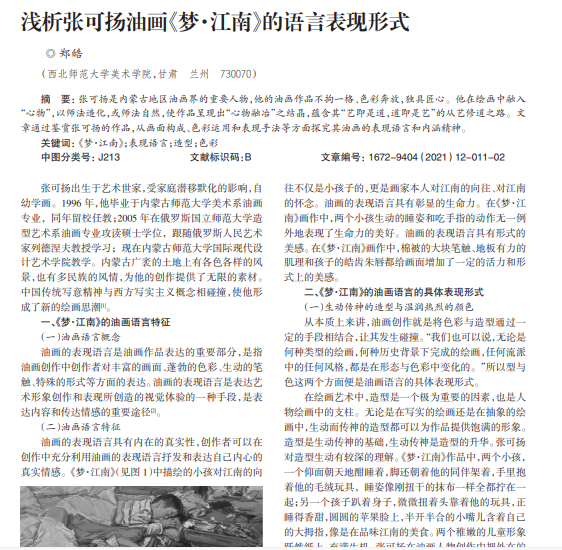 张可扬是内蒙古地区油画界的重要人物,他的油画作品不拘一格、色彩奔放,独具匠心。他在绘画中融入 “心物”,以师法造化,或师法自然,使作品呈现出“心物融冶”之结晶,蕴含其“艺即是道,道即是艺”的从艺修道之路。文 章通过鉴赏张可扬的作品,从画面构成、色彩运用和表现手法等方面探究其油画的表现语言和内涵精神。