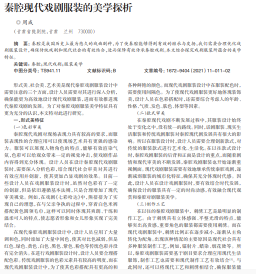 秦腔是我国历史上最为悠久的戏曲剧种,为了使秦腔能够得到有效的继承与发扬,我们需要合理优化戏 剧服装设计,确保传统戏剧和现代社会的有效结合,进而保障有效传承秦腔戏剧。本文综合探究戏剧服装所蕴含的美学 特征。