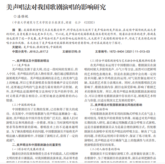 我国歌剧演唱艺术在发展过程中,科学地总结与运用了美声唱法的发声技法,在延续中国传统民族元素 的同时,自身发展方向也更加多元化。可以说,美声唱法对我国歌剧表演具有促进作用。随着社会经济的进步,歌剧表 演也获得了进一步发展,美声唱法对其产生的影响也逐渐深化,大大提升了我国歌剧演唱水平,形成了更具特色的演 唱方法和风格。本文论述了美声唱法对我国歌剧演唱的重要影响,并对其成因进行了探讨。