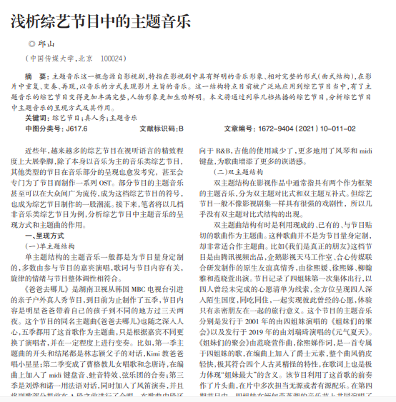 主题音乐这一概念源自影视剧,特指在影视剧中具有鲜明的音乐形象、相对完整的形式(曲式结构),在影 片中重复、变奏、再现,以音乐的方式表现影片主旨的音乐。这一结构特点目前被广泛地应用到综艺节目当中,有了主 题音乐的综艺节目变得更加丰满完整,人物形象更加生动鲜明。本文将通过列举几档热播的综艺节目,分析综艺节目 中主题音乐的呈现方式及其作用。