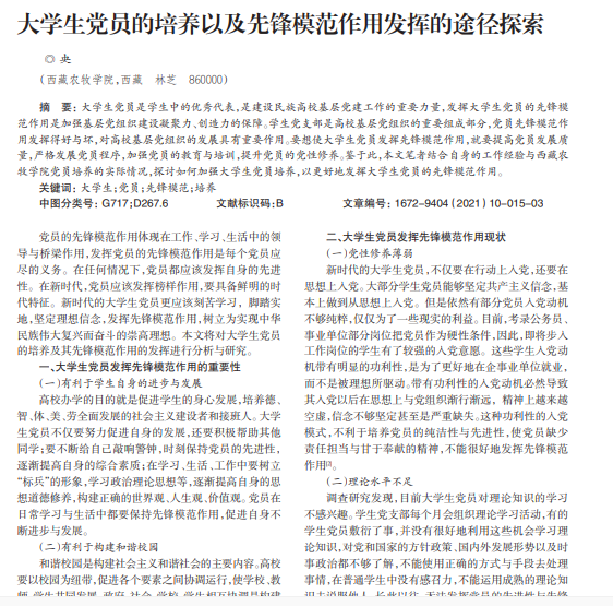 大学生党员是学生中的优秀代表,是建设民族高校基层党建工作的重要力量,发挥大学生党员的先锋模 范作用是加强基层党组织建设凝聚力、创造力的保障。学生党支部是高校基层党组织的重要组成部分,党员先锋模范作 用发挥得好与坏,对高校基层党组织的发展具有重要作用。要想使大学生党员发挥先锋模范作用,就要提高党员发展质 量,严格发展党员程序,加强党员的教育与培训,提升党员的党性修养。鉴于此,本文笔者结合自身的工作经验与西藏农 牧学院党员培养的实际情况,探讨如何加强大学生党员培养,以更好地发挥大学生党员的先锋模范作用。