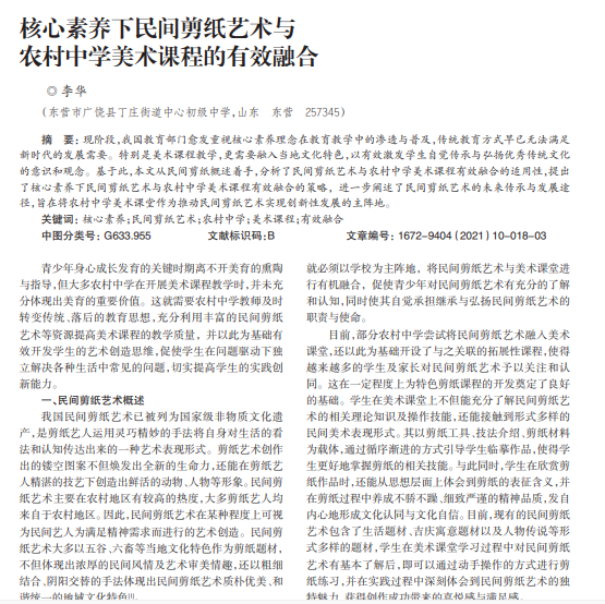 现阶段,我国教育部门愈发重视核心素养理念在教育教学中的渗透与普及,传统教育方式早已无法满足 新时代的发展需要。特别是美术课程教学,更需要融入当地文化特色,以有效激发学生自觉传承与弘扬优秀传统文化 的意识和观念。基于此,本文从民间剪纸概述着手,分析了民间剪纸艺术与农村中学美术课程有效融合的适用性,提出 了核心素养下民间剪纸艺术与农村中学美术课程有效融合的策略,进一步阐述了民间剪纸艺术的未来传承与发展途 径,旨在将农村中学美术课堂作为推动民间剪纸艺术实现创新性发展的主阵地。