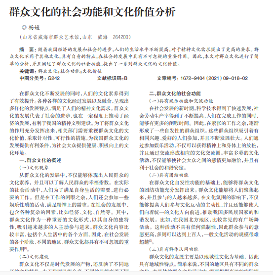 随着我国经济的发展和社会的进步,人们的生活水平不断提高,对于精神文化需求提出了更高的要求。群 众文化不同于其他文化,具有自身的特点,在社会的发展中具有不可忽视的重要作用。因此,本文对群众文化进行了简 单的分析,并且阐述了群众文化的社会功能,提出了一系列群众文化的文化价值。