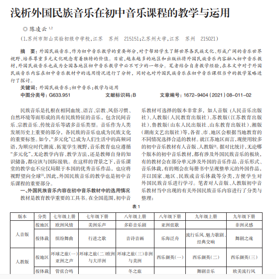 外国民族音乐,作为初中音乐教学的重要部分,对于帮助学生了解世界各民族文化、形成广阔的音乐世界 视野、培养尊重多元文化观念有着独特的价值。目前,越来越多的地区和出版社将外国民族音乐内容融入初中音乐教 材,外国民族音乐也成为全国各地区初中音乐教学中必不可少的一部分。笔者结合自身教学经验,在本文中对于外国 民族音乐内容在初中音乐教材中的选用情况进行了分析,同时也对外国民族音乐在初中音乐课程当中的教学策略进 行了探讨。