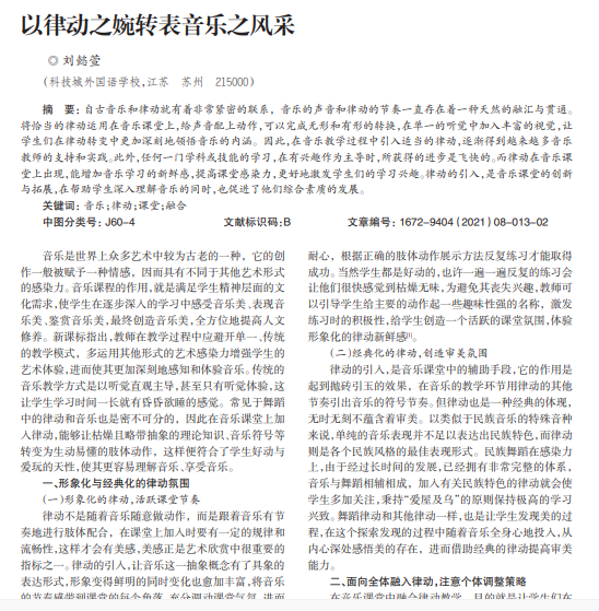 自古音乐和律动就有着非常紧密的联系,音乐的声音和律动的节奏一直存在着一种天然的融汇与贯通。 将恰当的律动运用在音乐课堂上,给声音配上动作,可以完成无形和有形的转换,在单一的听觉中加入丰富的视觉,让 学生们在律动转变中更加深刻地领悟音乐的内涵。因此,在音乐教学过程中引入适当的律动,逐渐得到越来越多音乐 教师的支持和实践。此外,任何一门学科或技能的学习,在有兴趣作为主导时,所获得的进步是飞快的。而律动在音乐课 堂上出现,能增加音乐学习的新鲜感,提高课堂感染力,更好地激发学生们的学习兴趣。律动的引入,是音乐课堂的创新 与拓展,在帮助学生深入理解音乐的同时,也促进了他们综合素质的发展。