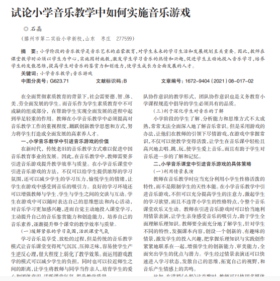 小学阶段的音乐教学是音乐艺术的启蒙教育,对学生未来的学习生活和发展规划至关重要。因此,教师在 课堂教学时必须以学生为中心,实施因材施教,激发学生学习音乐的热情和兴趣,促进学生主动地投入音乐学习,培养 学生的发散思维,提高学生对音乐的鉴赏力和创造力,使学生成长为全面发展的人才。