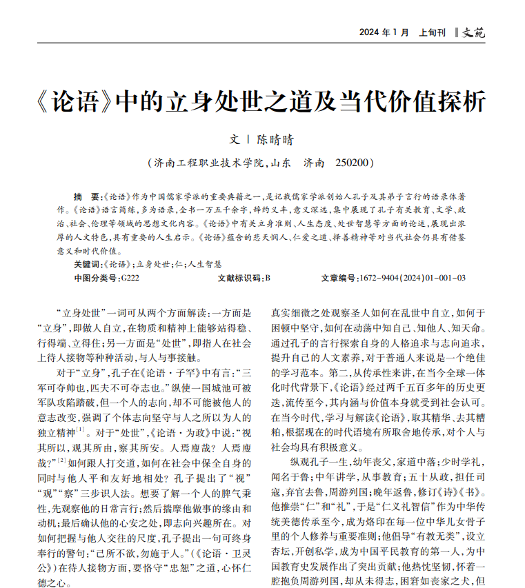 《论语》作为中国儒家学派的重要典籍之一,是记载儒家学派创始人孔子及其弟子言行的语录体著 作。《论语》语言简练,多为语录,全书一万五千余字,辞约义丰,意义深远,集中展现了孔子有关教育、文学、政 治、社会、伦理等领域的思想文化内容。《论语》中有关立身准则、人生态度、处世智慧等方面的论述,展现出浓 厚的人文特色,具有重要的人生启示。《论语》蕴含的悲天悯人、仁爱之道、择善精神等对当代社会仍具有借鉴 意义和时代价值。