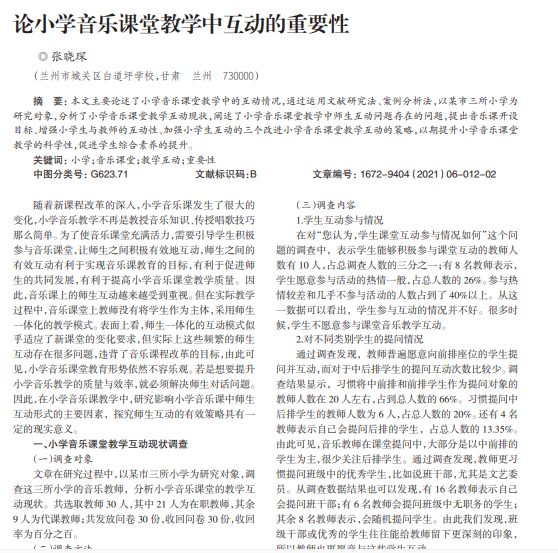 本文主要论述了小学音乐课堂教学中的互动情况,通过运用文献研究法、案例分析法,以某市三所小学为 研究对象,分析了小学音乐课堂教学互动现状,阐述了小学音乐课堂教学中师生互动问题存在的问题,提出音乐课开设 目标、增强小学生与教师的互动性、加强小学生互动的三个改进小学音乐课堂教学互动的策略,以期提升小学音乐课堂 教学的科学性,促进学生综合素养的提升。